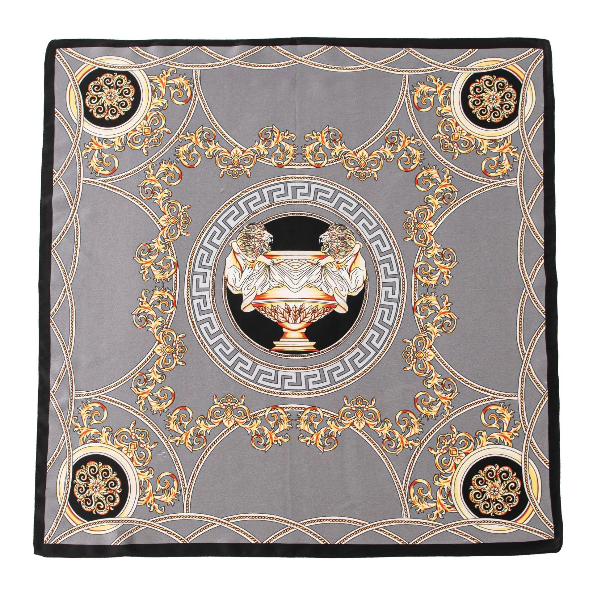 The Imperial Lion Scarf radiates grandeur and strength, drawing inspiration from classical motifs of power and artistry. At its center, two sculpted lions hold a regal urn, surrounded by intricate golden scrollwork and bordered by Grecian-inspired patterns. The rich interplay of gray, gold, and black lends this design a timeless aura of luxury. Crafted from mulberry silk, it is both bold and exquisitely refined.