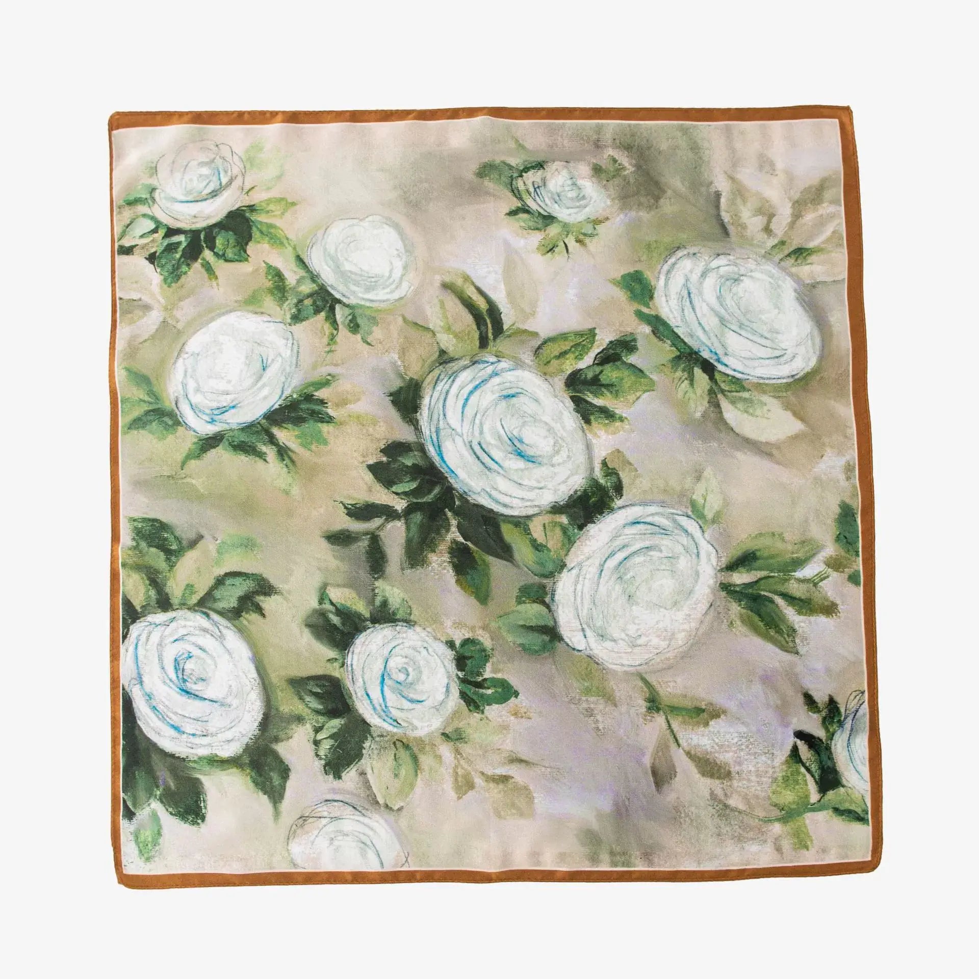 The Whispering Roses Scarf captures the ethereal beauty of white blooms drifting across a soft, dreamlike canvas. Gentle brushstrokes depict roses in full blossom, their delicate petals highlighted with subtle hints of blue and surrounded by lush green foliage. The warm brown border frames the composition, adding grounding elegance to this airy floral piece. Crafted from mulberry silk, it is romantic, refined, and timeless.