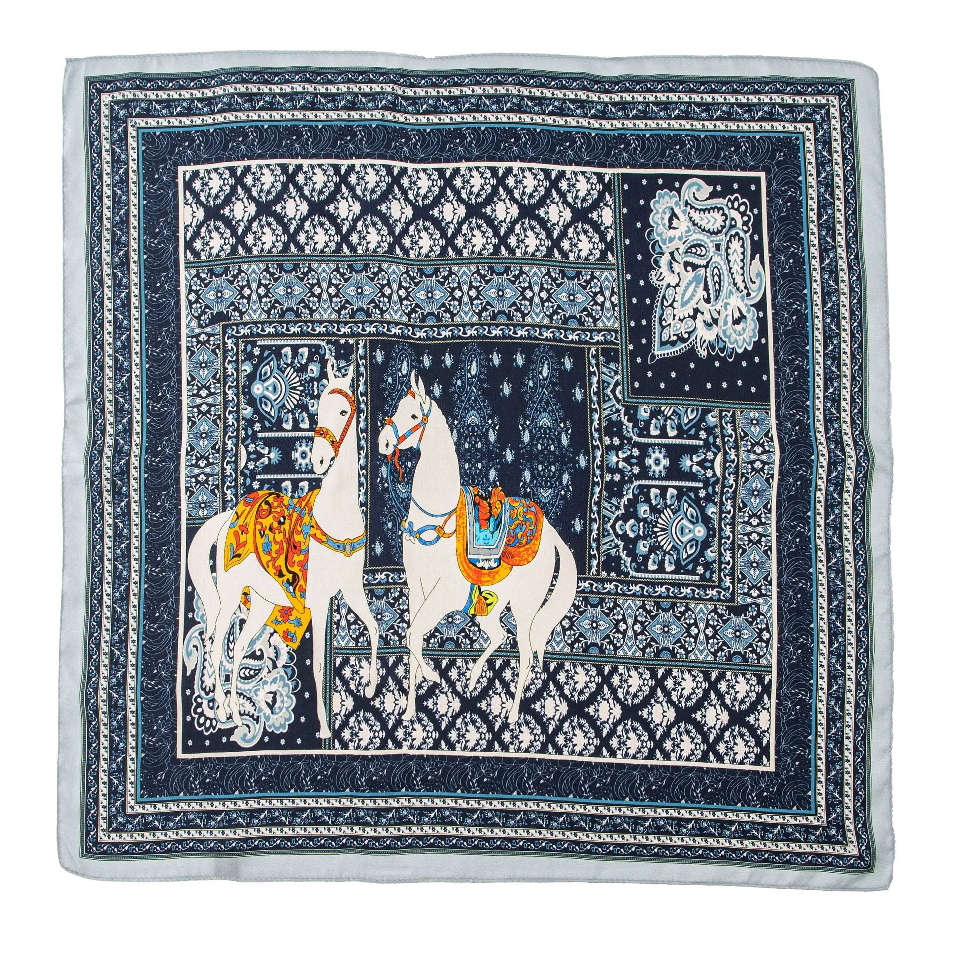 The Imperial Steeds Scarf pays tribute to timeless equestrian elegance, depicting two noble white horses adorned with richly patterned saddles in vivid orange, blue, and gold. Surrounded by intricate ornamental borders in navy and ivory, the design evokes the grandeur of royal courts and ceremonial parades. Crafted from mulberry silk, this piece unites aristocratic symbolism with luxurious artistry.